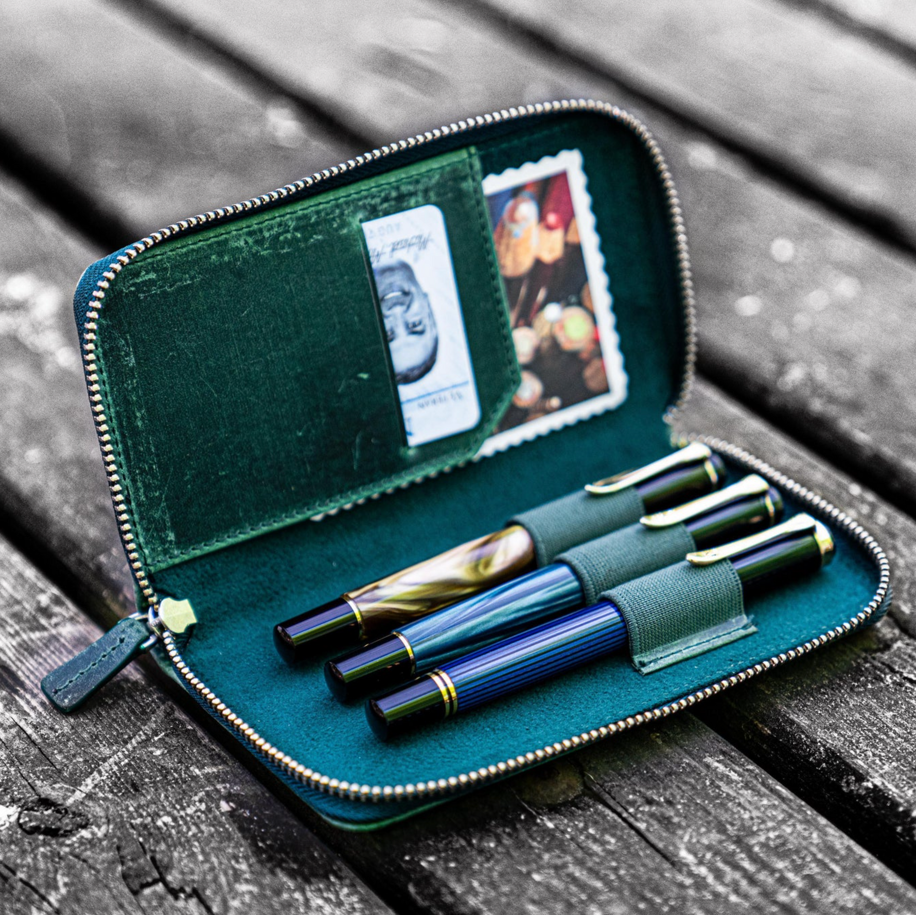 Galen Leather - Leather Zippered 3 Slots Pen Case - Crazy Horse Forest Green
