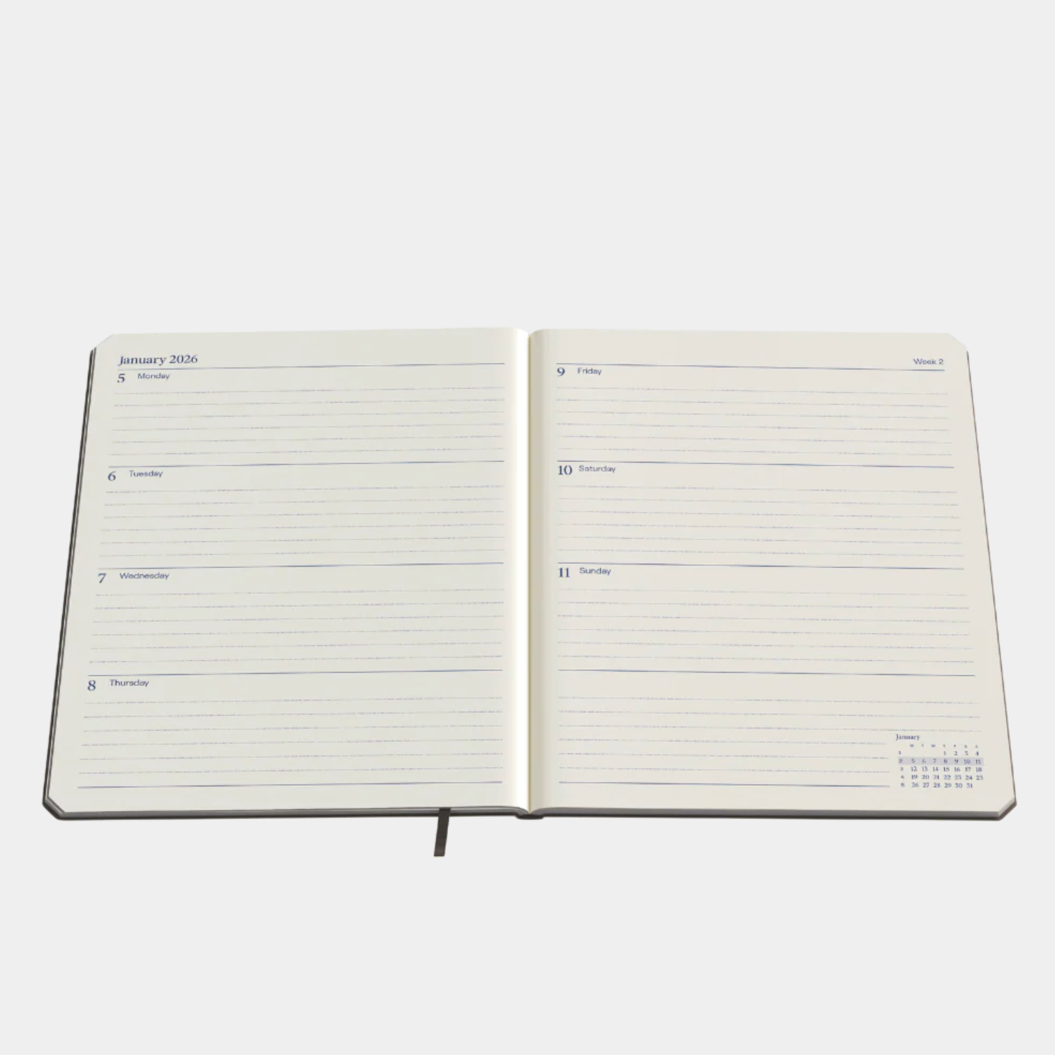 Übersichtlich auf zwei Seiten: Deine gesamte Woche im Überblick. Keine starren Zeitfenster, sondern volle Freiheit bei der flexiblen Tagesplanung. Samstag und Sonntag erhalten die gleiche Aufmerksamkeit wie der Rest der Woche, sodass du deine Wochenenden optimal planen kannst.