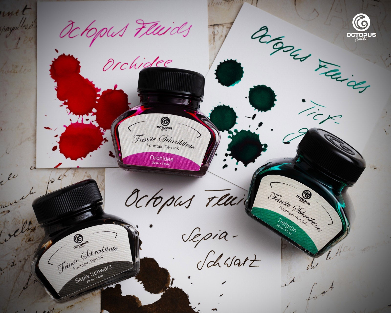Octopus Fluids präsentiert eine exklusive Kollektion von klassischen Schreibtinten, die durch einen gleichmäßigen Tintenfluss und wunderschönes Shading gekennzeichnet sind. Unsere hochwertigen Schreibtinten werden mit größter Sorgfalt in unserem Labor in Dresden entwickelt und hergestellt. Jede Tintenfarbe basiert auf einer eigenen Rezeptur, welche nur ausgewählte, hochwertige Inhaltsstoffe verwendet. Unser Qualitätsanspruch ist hoch: von der ausgewogenen Schattierung bis hin zur minimalen Fiederung; alles ist darauf ausgelegt, ein Schreiberlebnis höchster Güte zu bieten.