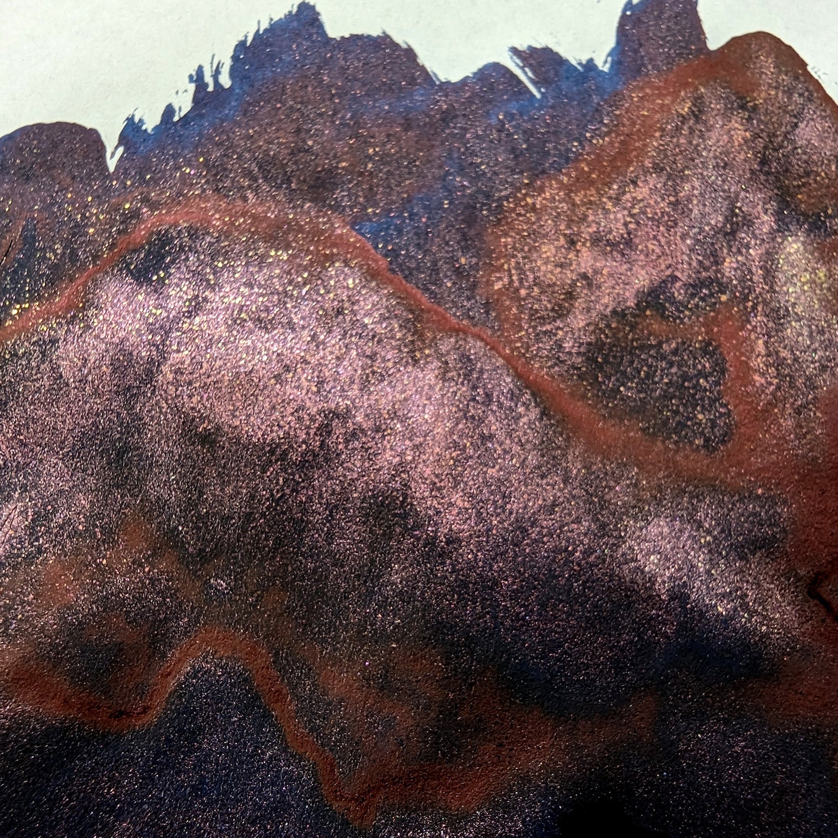Ein tiefes Dunkelblau/Schwarz mit dunkelrotem Schimmer und einem Schimmer, der zwischen Gold und Rostrot schwankt.