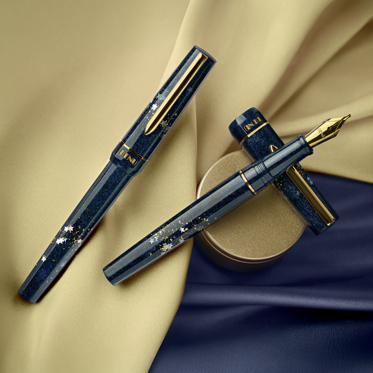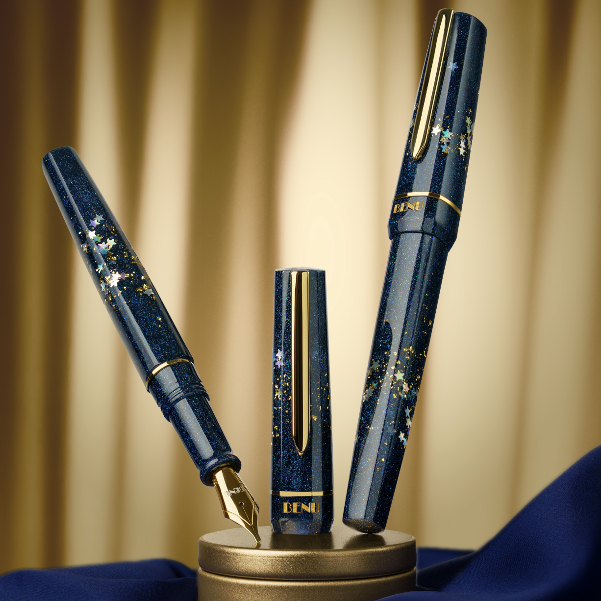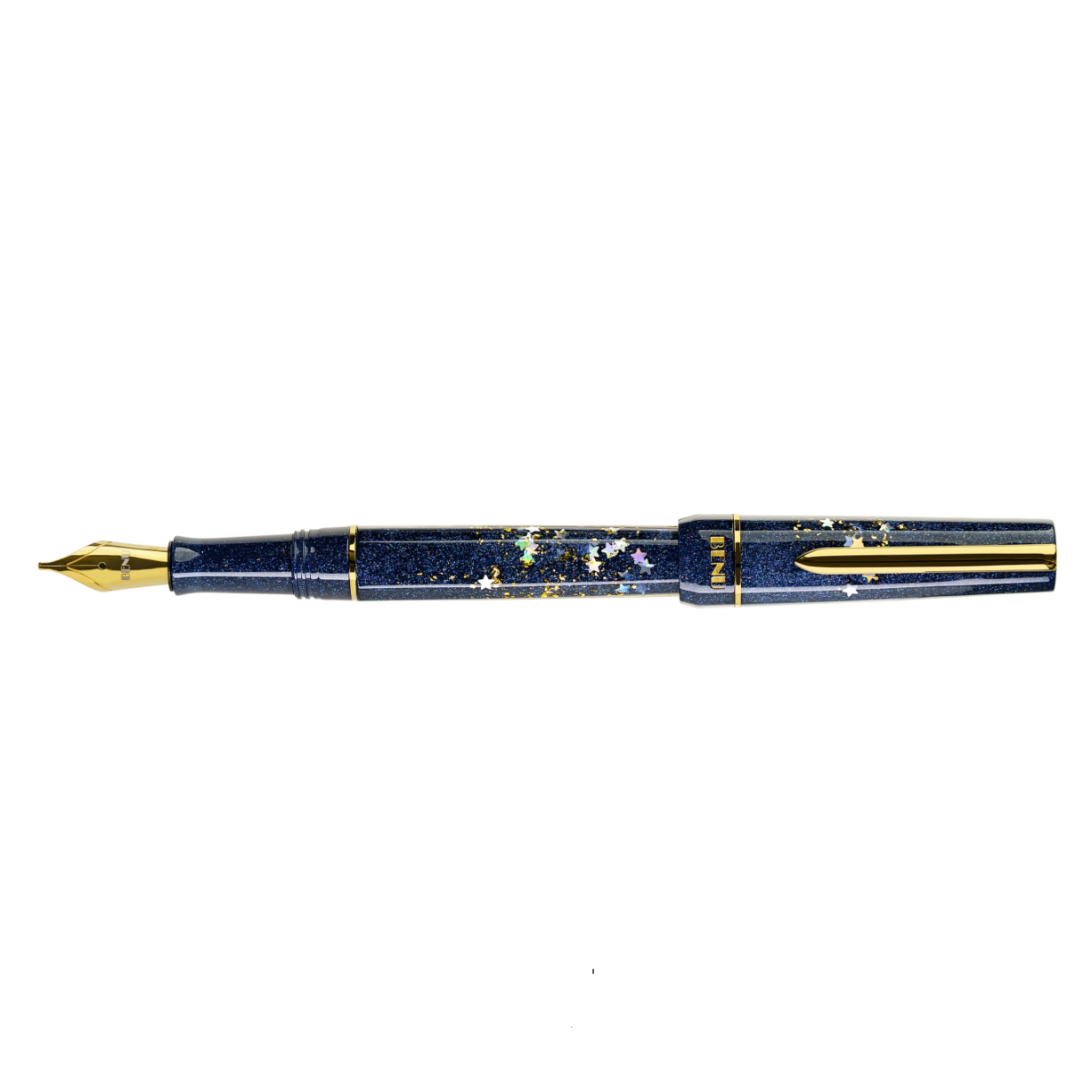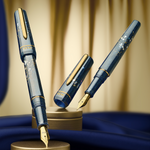 Der Benu Movie Star Füllfederhalter ist aus einem satten, tiefblauen Acrylharz gefertigt, das mit holografischem Glitzern, silbernen Sternen und dezenten goldenen Glitzerakzenten durchzogen ist. Das schimmernde Material fängt die Magie des roten Teppichs und die Anziehungskraft filmischer Leistungen ein. Goldfarbene Beschläge vervollständigen das Design und verleihen ihm Wärme, Luxus und zeitlose Raffinesse.